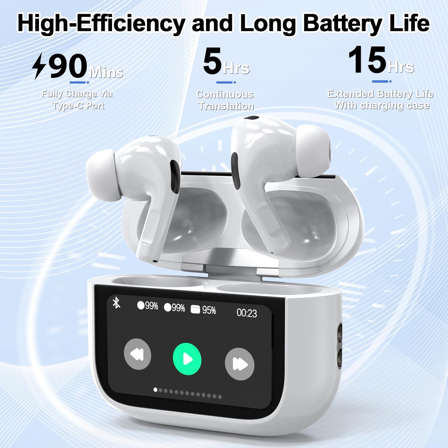 The AI Language Translator Earbuds boast a sleek and intuitive design, with a vibrant color LCD display on the charging case that provides easy control over music, volume, and battery levels. The earbuds themselves are lightweight and ergonomically designed, reducing pressure and discomfort even during extended use. The device also features a smart touch control system, allowing users to customize sound effects, enjoy on-screen lyrics, and even snap photos remotely with just a tap.