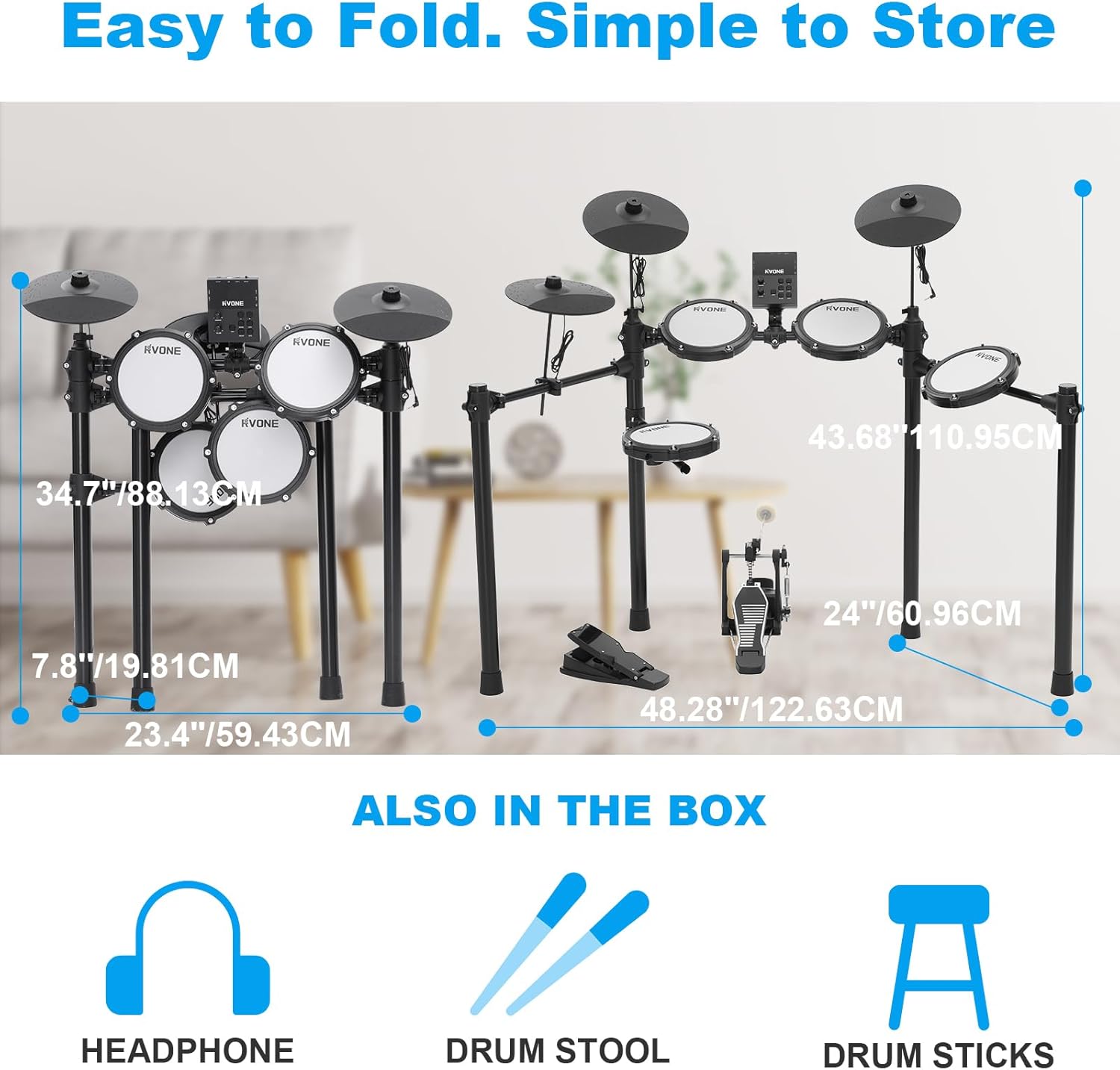 One of the standout features of this drum set is its completeness. The kit includes a kick hammer, a pedal, drum pads, cymbals, a sturdy metal frame, and a drum module. This all-in-one package ensures that you have everything you need to start drumming right away, without having to invest in additional equipment. The kit also comes with a drum throne, sticks, headphones, pedals, and cables, making it an excellent value for beginners.
