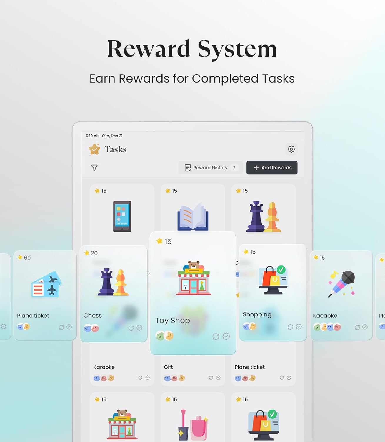 The Cozyla Digital Calendar+ 2 takes chore management to the next level with its digital chore chart and reward system. The electric calendar assigns chores to each family member, and everyone is assigned a unique color and can customize their own avatar for a personalized experience. Family members earn points by completing chore charts, making responsibilities both rewarding and motivating. This feature encourages teamwork, accountability, and a sense of accomplishment, helping to create a more harmonious and productive household.